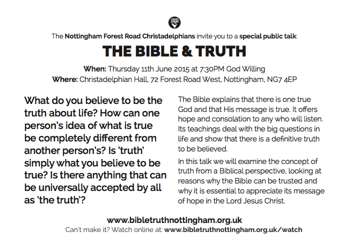To find out more about this subject and the Bible's definition of "truth", why not tune in online to a special Bible talk that the Nottingham UK Christadelphian's are putting on, on Thursday 11th June 2015 at 7:30PM (UK Time) God willing. The talk is called “The Bible and Truth”. Simply go to www.bibletruthnottingham.co.uk/watch from 7PM (UK Time) to access the broadcast.